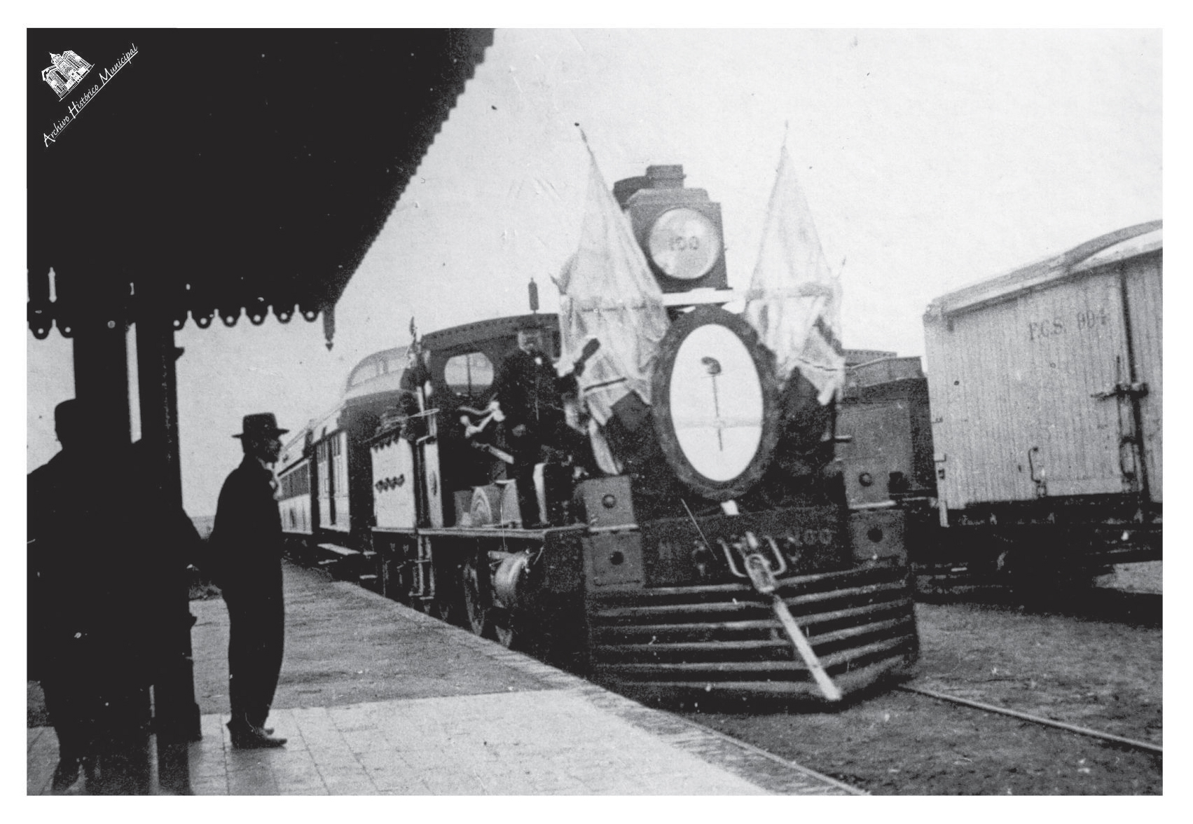 En esta foto se puede apreciar el arribo de la primera locomotora del Ferrocarril del Sud a la estación Punta Alta. En la máquina, empavesada con banderas inglesas y argentinas, se observa colgado del estibo, a Mr. Arthur Coleman. La construcción de la Base Naval, iniciada en 1898, determinó la necesidad de prolongar las vías férreas del Ferrocarril del Sud, de capital británico, desde Grünbein a los obradores a fin de transportar materiales y, al mismo tiempo, servir a la población del lugar. La línea se tendió en tiempo récord: 48 días. El 30 de agosto transportó los primeros cañones hasta Baterías. El 26 de septiembre de 1898 comenzó a funcionar el servicio de carga y el 1° de noviembre el de pasajeros, en la estación llamada Punta Alta, más tarde Puerto Belgrano, donde hoy funciona el Museo Naval. Unos metros más adelante, el ramal se transformaba en el Ferrocarril Estratégico hasta Baterías. Esta línea férrea es importante en la historia de la ciudad puesto que fue el estímulo para que los habitantes se congregaran espontáneamente en torno a las vías y a la estación, de la que la ciudad tomó su nombre.
